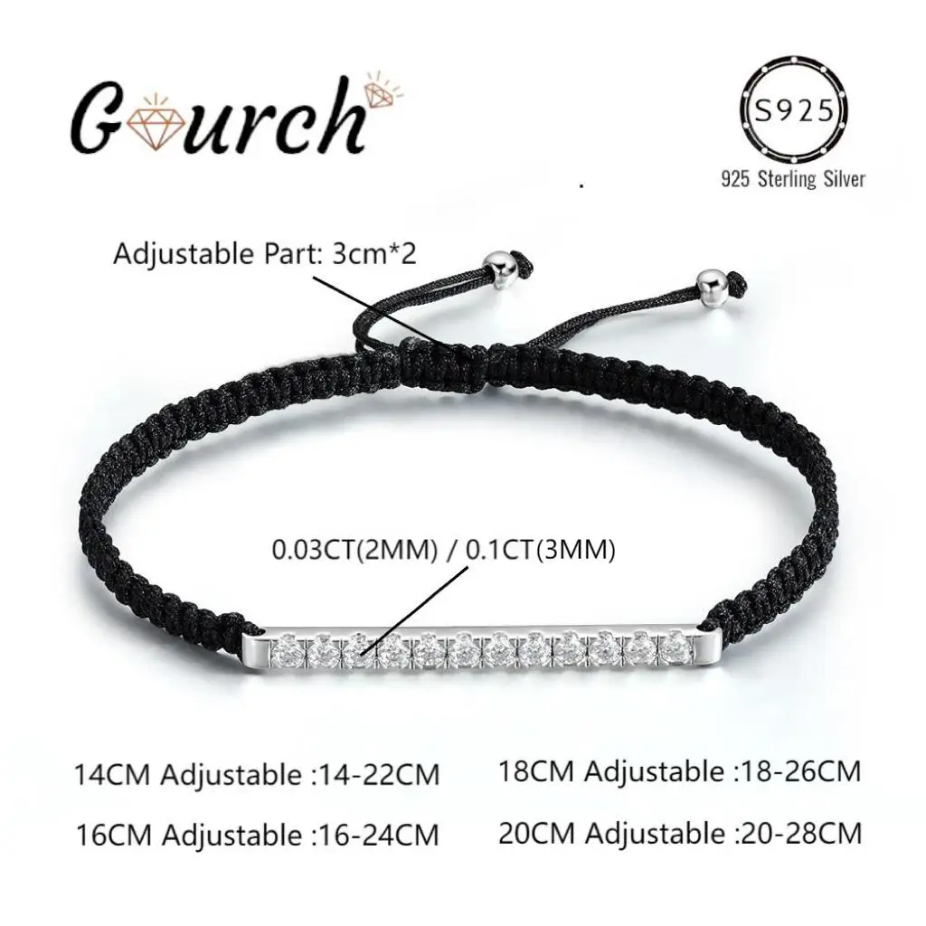 Gourch 2/3mm Adjustable Braided Rope Moissanite Bracelet Lab Grown 925 Sterling Silver Fine Jewelry for Women Men Party Gift